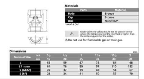 Thông số kỹ thuật của Van 1 chiều đồng Kitz RF: